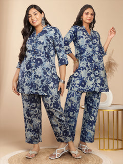 Plus Size Indigo Cotton Floral A-Line Co-ord Set