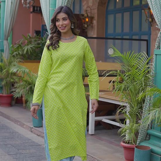 Lime Green Ethnic Motif Kurta with Blue Cotton Palazzo