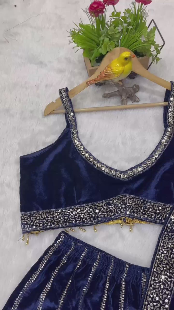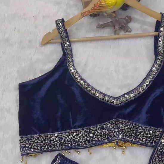 The designer blouse is stitched to perfection, featuring a stylish Bollywood-inspired dip-U neckline, sequin embellishments, and a secure back hook closure. Paired with a matching Velvet dupatta showcasing laheriya patterns, sequin artistry, and a four-side embroidered lace border — the ensemble radiates refined charm.