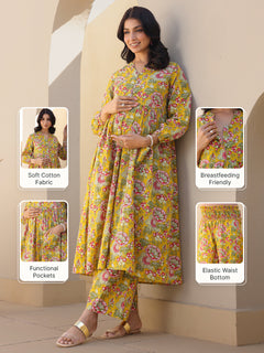 Mustard Pure Cotton Floral Printed A-line Maternity Kurta Pant Set