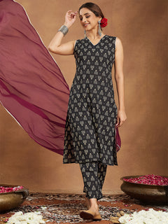 Women's Black Cotton Ethnic Motifs Printed Straight Kurta Set