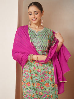 Women's Mint Green Pure Cotton Yoke Embroidered Floral Printed Straight Kurta Set
