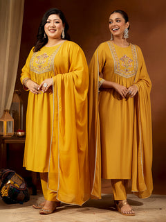 Women's Mustard Silk Blend Embroidered Straight Kurta Set